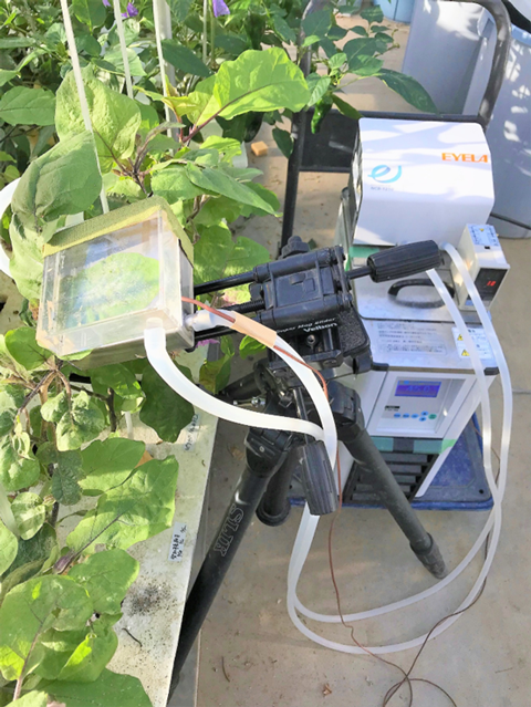 実際の盛夏期の高温条件下でナス(Solanum melongena)を栽培し、光合成、花粉稔性、花粉量、結実率、果実品質(果皮色等)を時系列に測定します。得られたデータに基づき、高温によって現れる障害の解析と品種間差の検出を行い、熱ストレス耐性品種と感受性品種を仕分けるとともに、各品種の反応性および熱ストレス耐性機構の解明を目指します。