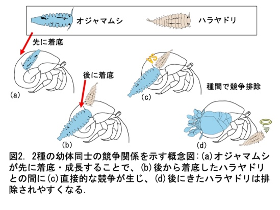 - 等脚目エビヤドリムシ科は、カイアシ類を中間宿主、十脚類を最終宿主とする外部寄生虫類である。ユビナガホンヤドカリの腹部に寄生するエビヤドリムシ科には、ヤドカリノハラヤドリとヤドカリノオジャマムシの2種が知られている[図1]。私は、これら2種の生息を伊勢湾で初めて確認し、以来、ヤドカリへの寄生生態の解明を野外調査や室内実験を通じて進めてきた。その結果、幼体では野外の同一宿主個体から2種が同時に頻繁に観察された一方、成体になると必ずどちらか 1種しか確認されなかった。これは種間で成長に伴い競争排除が生じたためと考えられる。また、2種の幼生は、最終宿主のヤドカリ類に着底する時期が異なることも明らかにした。そこで、本研究では先に着底する種が生存率を高めることができるという仮説をたて[図2]、着底時期の差が競争結果にどのように影響しているかを飼育操作実験により検証する。