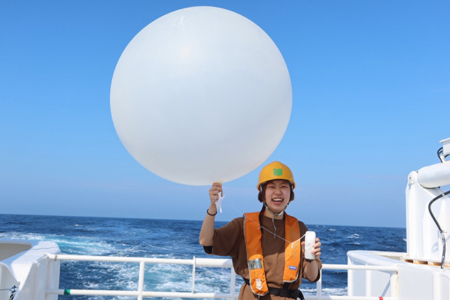 バルーンで観測機器を飛ばし、大気下層から上層までの気温、湿度、気圧などを観測する。
